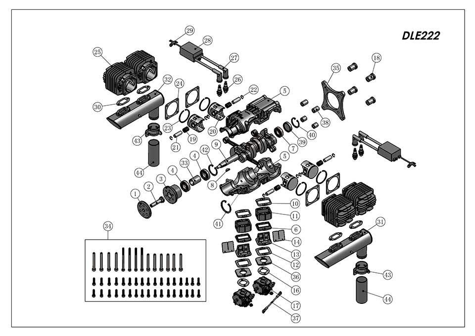 Featuring dual carburettors for precise tuning, sealed bearings for reduced friction and enhanced longevity, and two mufflers to keep noise levels in check, the DLE 222 V3 is built for both performance and endurance. Complete with dual electronic ignition modules, standoffs, hardware and more, this engine delivers unmatched value in the 200–230cc class.