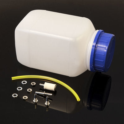Extra strong tank s made from HDPE with blue PP (= Polypropylene) screw caps. Complete with large nipples, cotton felt clunk filter and petrol resistant clunk tube. Weight of tank bottle with lid but without fittings: 1500 ccm = 127 g.