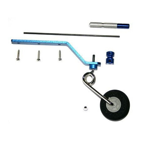 Duralumin, durable and lightweight rear landing gear for flying models. The wheel is steered by connecting the wheel lever to the rudder with a steel pusher. 35mm Rubber wheel.