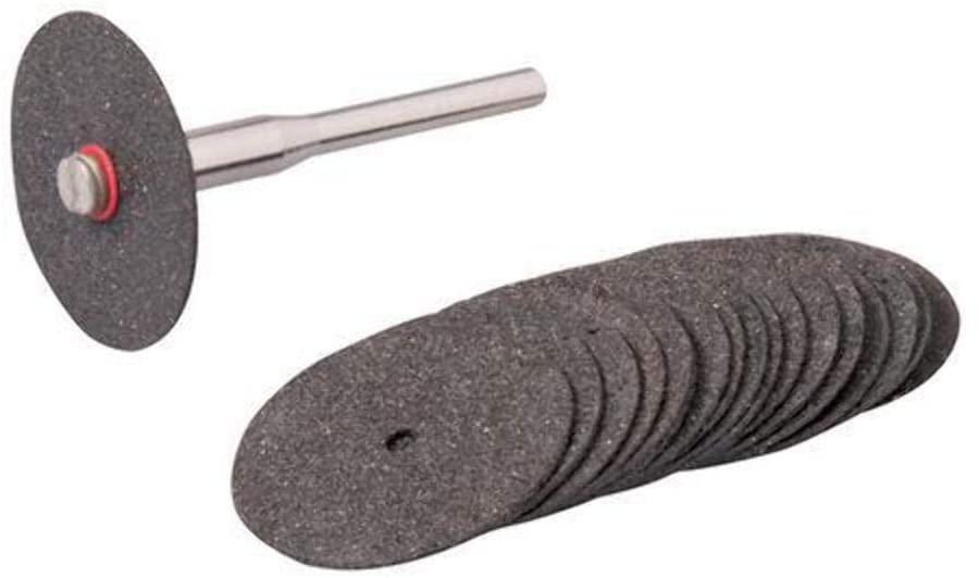 Resin-bonded aluminium oxide discs for cutting, trimming and deburring. For use on metals, alloys, plastics, fibreglass and wood. Compatible with most rotary tools including Silverline, GMC and Dremel. Includes 17 x 24mm discs and 3.17mm mandrel. Max 28,000rpm.