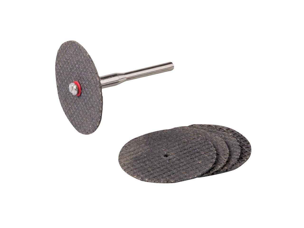 Resin-bonded aluminium oxide discs for cutting, trimming and deburring. For use on metals, alloys, plastics, fibreglass and wood. Compatible with most rotary tools including Silverline, GMC and Dremel. Includes 5 x 31mm discs and 3.17mm mandrel. Max 28,000rpm.