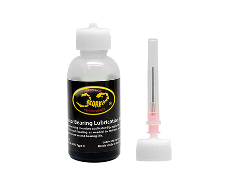 The Scorpion Motor Bearing Lubrication Kit contains a 23ml bottle of bearing lubricant, a leak-proof twist-on cap, and a needle point applicator (19.5mm in length, 1.3mm in diameter) with protective cover.