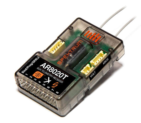 The Spektrum™ AR8020T is an advanced 8-channel receiver designed for serious RC pilots who demand reliability, telemetry, and ease of use. Compatible with all Spektrum DSMX® and DSM2® transmitters, this compact receiver fits a wide range of aircraft from park flyers to giant-scale models.