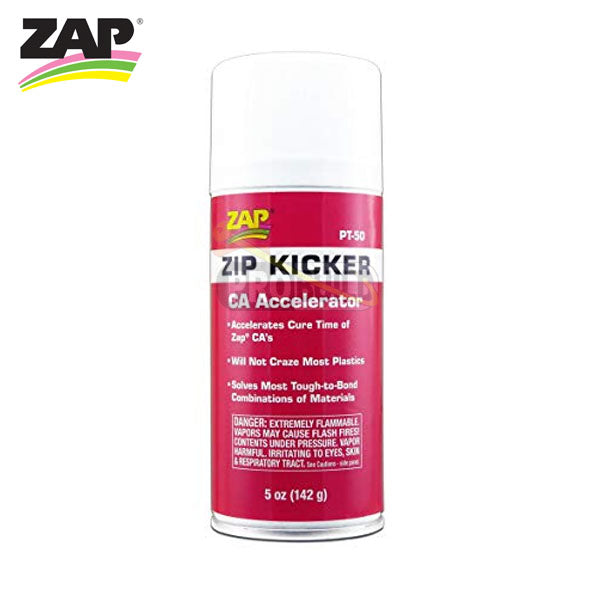 ZIP KICKER Is the best way to accelerate the cure time of all brands of super glues. When sprayed directly on a glued joint it forces the immediate cure of the CA glue. Thick or slow style glues form an instant hard outer shell when sprayed with ZIP KICKER, the catalytic action begins curing the remaining liquid CA at an accelerated rate from the outside in, creating a strong bond.This action allows the creation of small to very large fillets and the ability to fill large gaps or cracks.Wood turners love this ability and often are able to progressively fill in large cracks and save the piece they are working on. ZIP KICKER will not harm most materials making perfect to use not only on wood but various plastics, metals, paints, and fabrics.